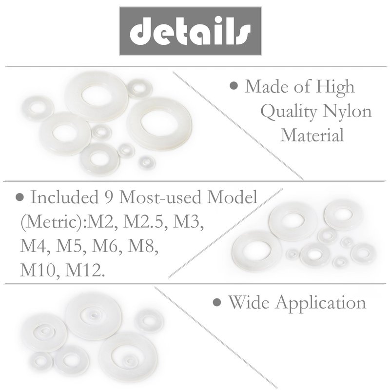 - Size: One Set Included 720pcs Nylon Washers, 9 Most-used Model (Metric): M2, M2.5, M3, M4, M5, M6, M8, M10, M12. The complete range of sizes are enough to meet your various needs in life.