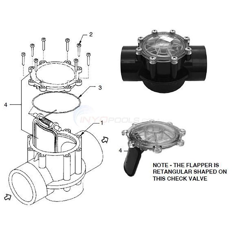 This check valve cover with flapper assembly replacement kit fits Zodiac Jandy Spring Check Valve 7056 Cover with Flapper Assembly. This kit includes flapper assembly, pin, cover, spring, and O-ring. This repair kit assembly is compatible with Jandy Check Valve Models 7235, 7236, 7305, 7511, 7512.