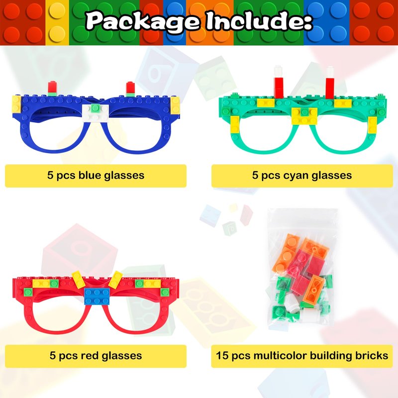 - COMPLETE FUN PACK: The whole set of building blocks glasses party favors includes 15pcs building blocks glasses frames (5 blue, 5 green, and 5 red), each carnival glass frame comes with a pack of colored building bricks. Children will become creative builders when they use these colorful toys to build glasses