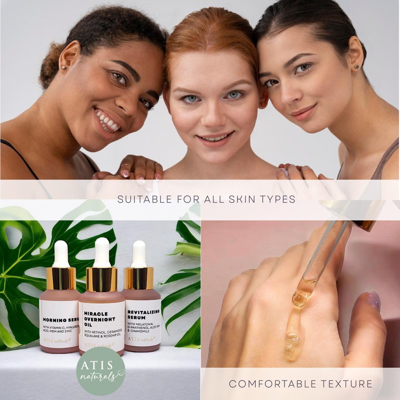 - ✅ SKIN CYCLING CARE: Start with the Morning Serum, containing Hyaluronic acid, Vitamin C, MSM, and Zinc. Follow up in the evening with either Miracle Overnight Oil for wrinkle reduction or the D-Panthenol, Melatonin, Aloe Vera and Chamomile Revitalizing Serum for skin restoration.