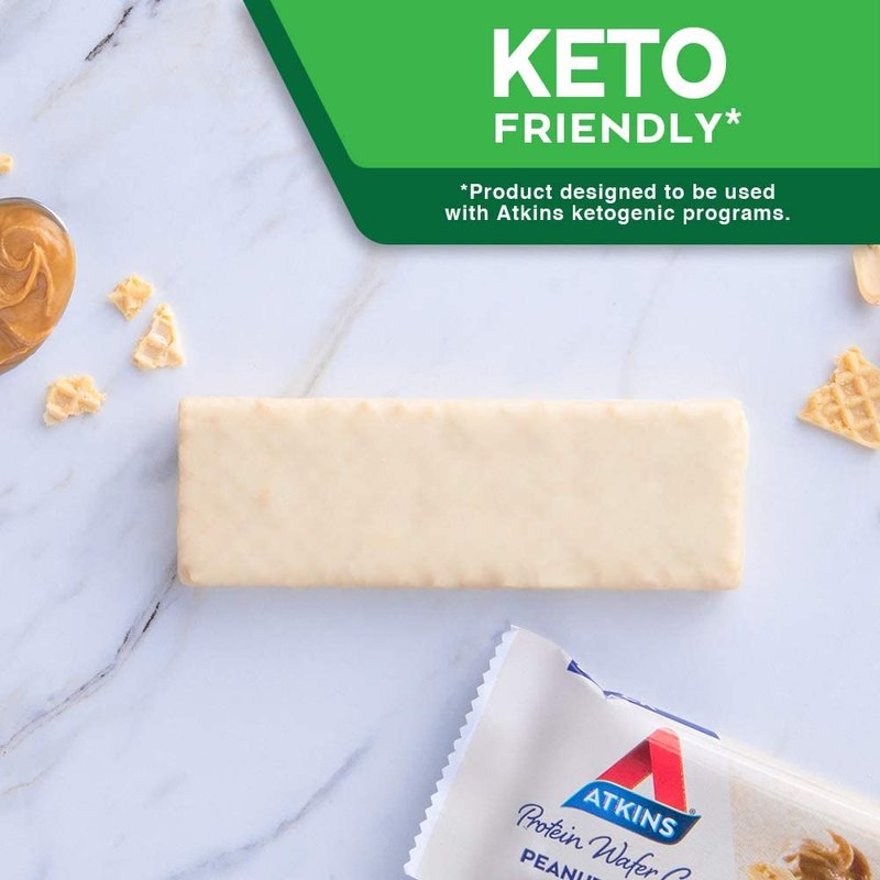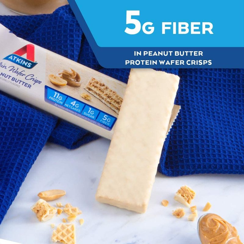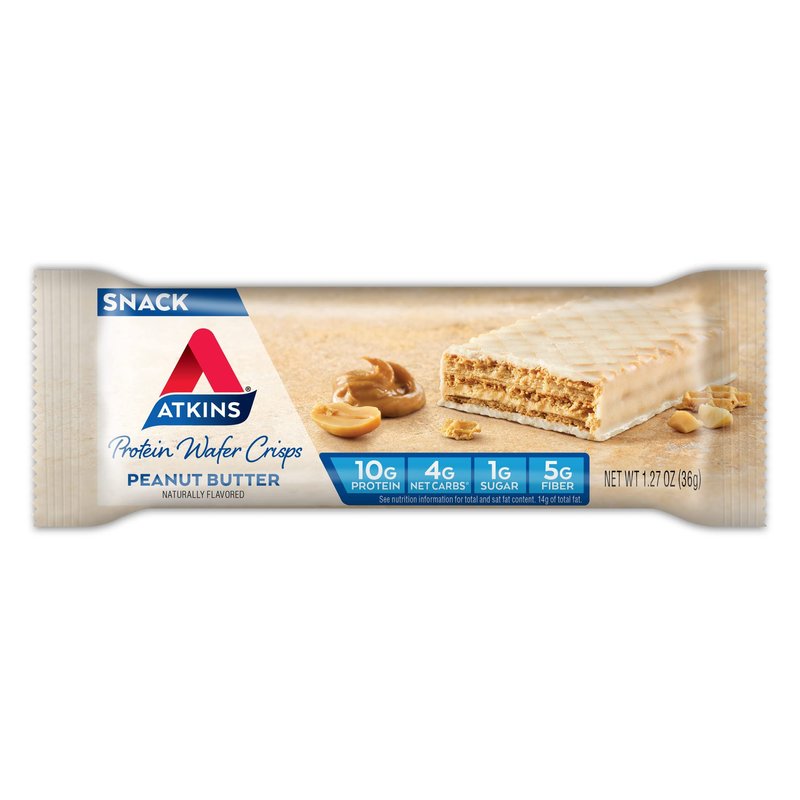 - AT HOME OR ON-THE-GO. Atkins Peanut Butter Protein Wafer Crisps. Enjoy delicious wafer crisps that fit right into your busy schedule, with 10g of protein, 4g of net carbs, and 1g of sugar per serving*. This is Today’s Atkins.