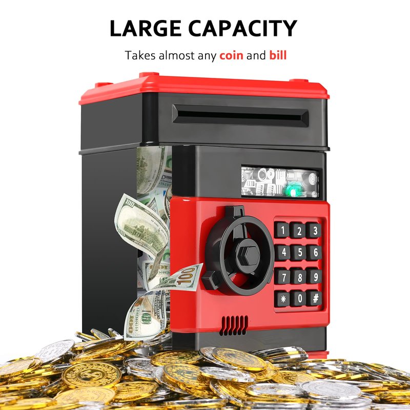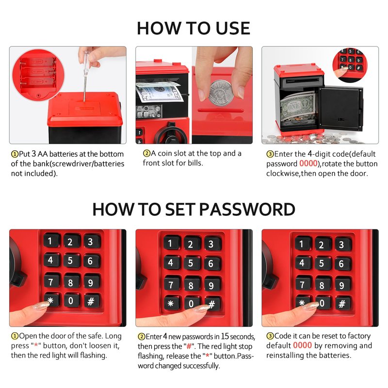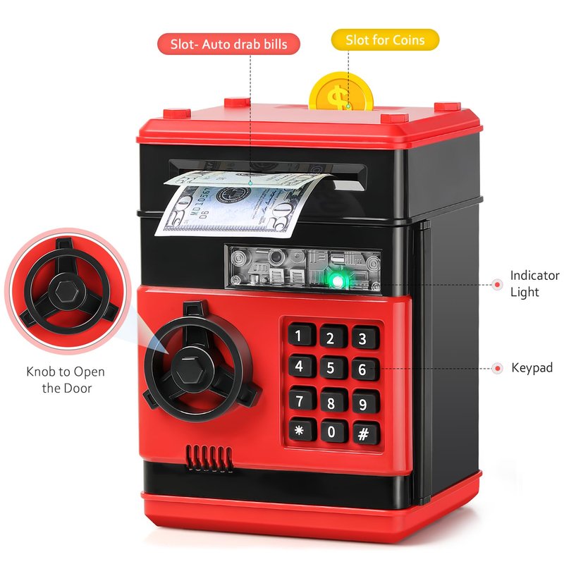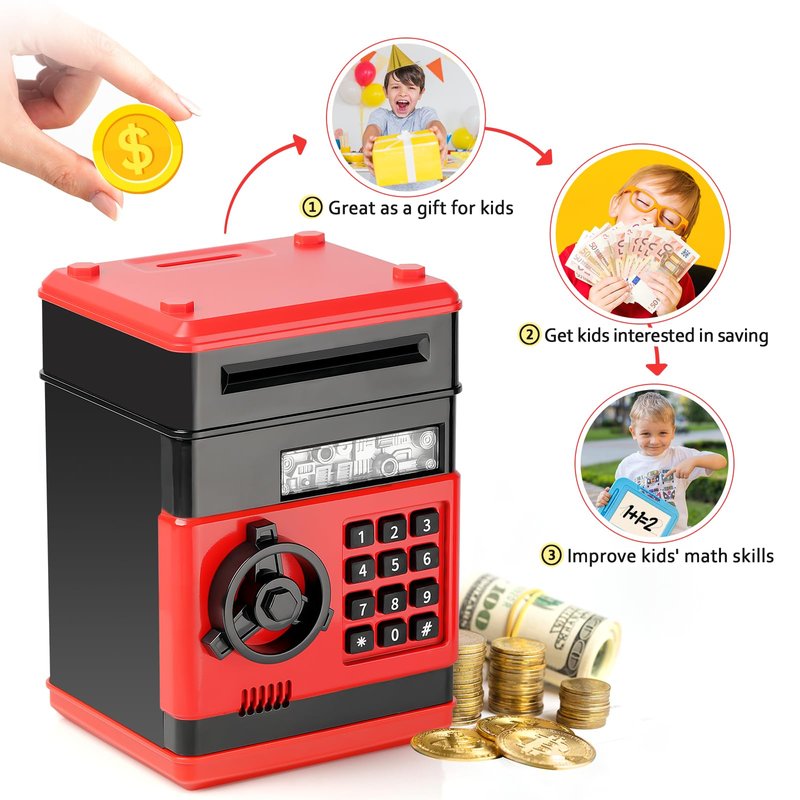 - 💰【Keep Safe Money】Open the door of the kids safe with 4-digit code(default password 0000). ATM piggy bank for boys, easy to program a personalized code, perfect for what your boys/girls needed to keep their money - safe! Kids will love hiddening their "valuables" in this coin bank.