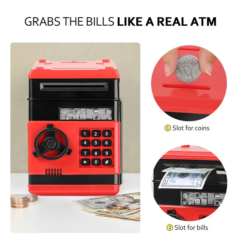 ATM Piggy Bank for Boys Girls, Vcertcpl Mini ATM Coin Bank Money Saving Box with Password, Kids Safe Money Jar for Adults with Auto Grab Bill Slot, Great Gift Toy Bank for Kids (Red+Black 02)
