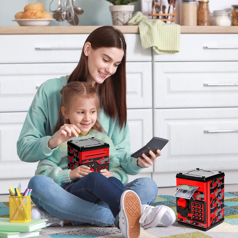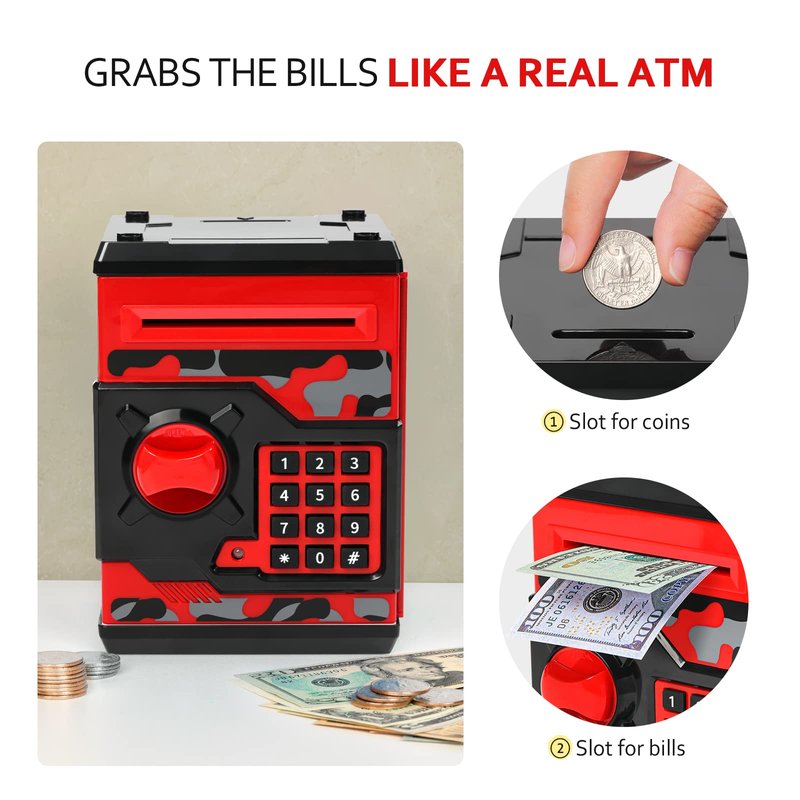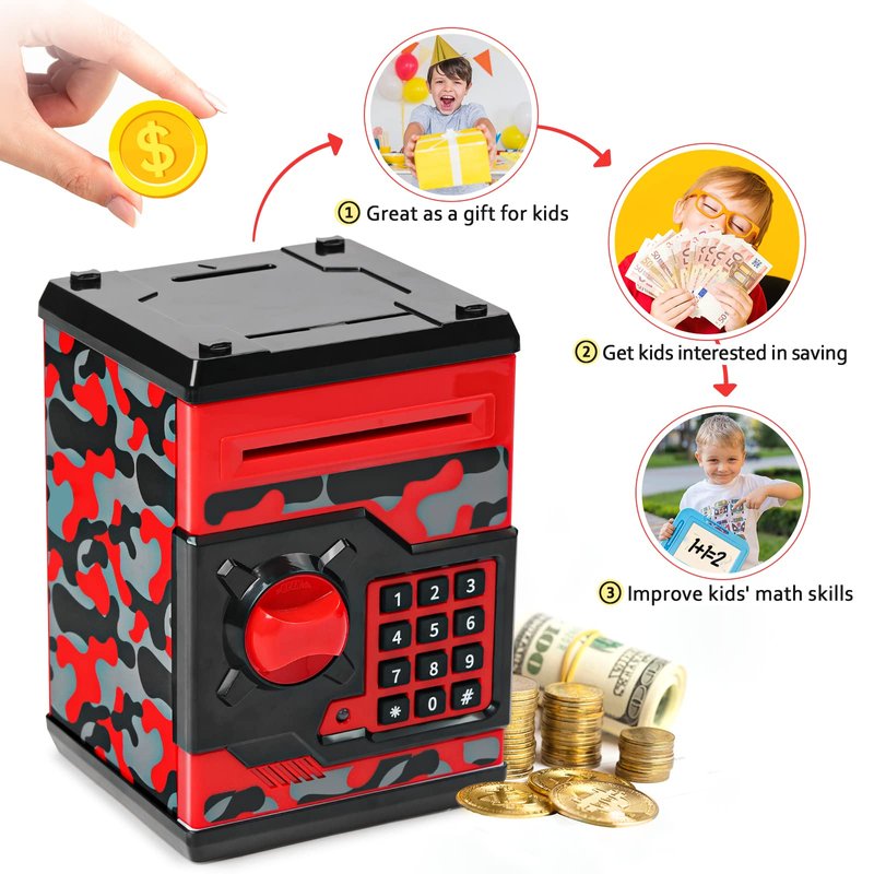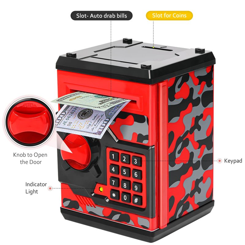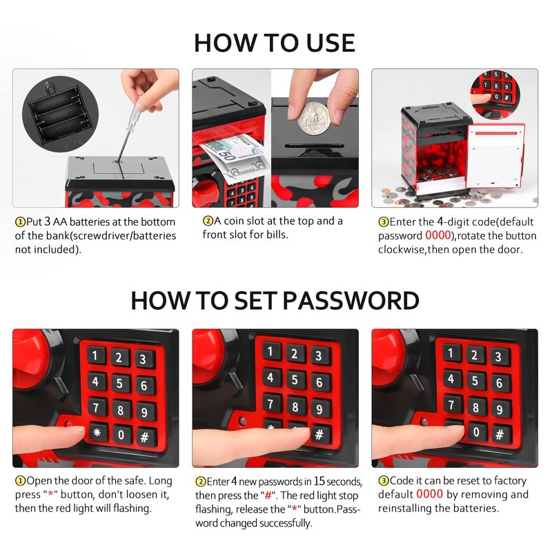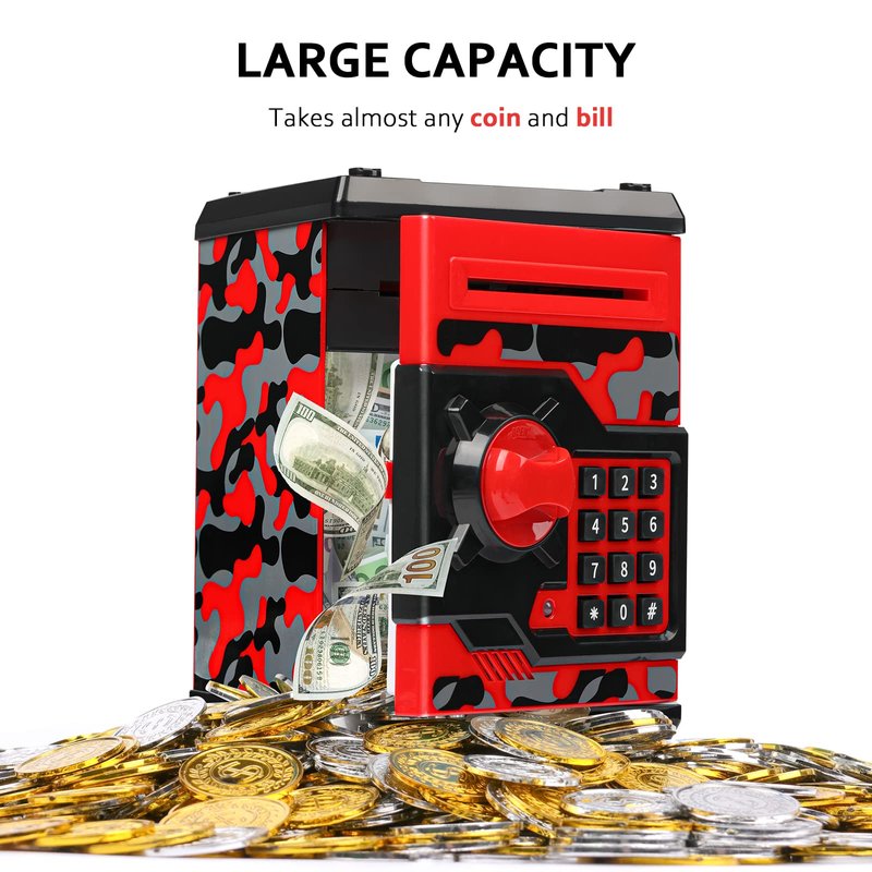 - 【Keep Safe Money】Open the door of the kids safe with 4-digit code(default password 0000). ATM piggy bank for boys, easy to program a personalized code, perfect for what your boys/girls needed to keep their money - safe! Kids will love hiddening their "valuables" in this coin bank.