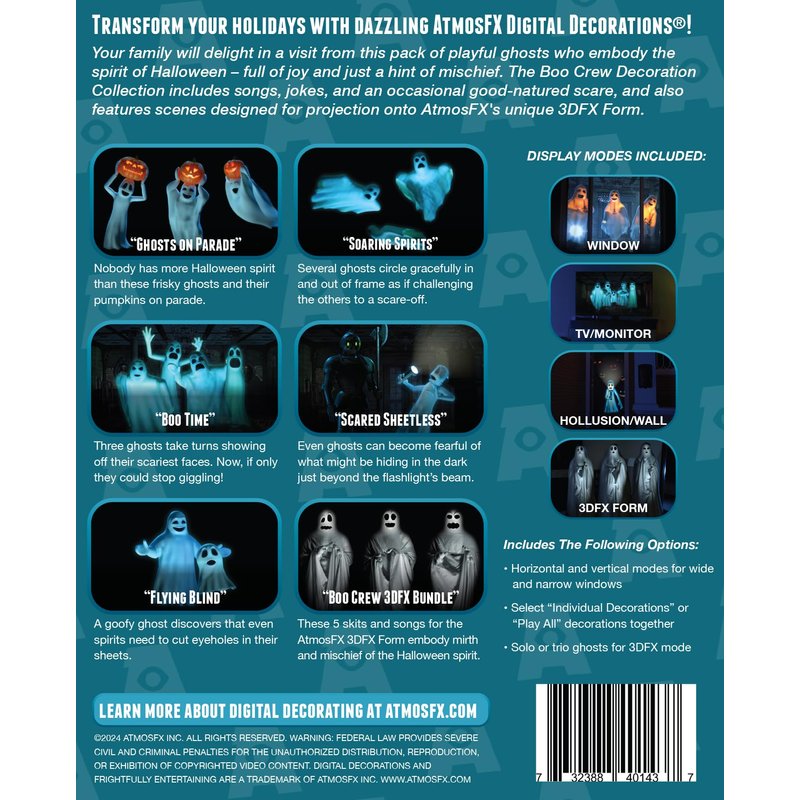 AtmosFX Halloween Special Effects Video on USB Stick - with 5 different scenes. Your family will enjoy a visit from three playful ghosts who have materialized at your home. The Boo Crew Decoration Collection is full of songs, jokes and an occasional good-natured scare. These spirited spirits are the embodiment of Halloween – full of joy and with just a hint of mischief. This collection also features scenes made for projection onto AtmosFX's unique 3DFX Forms.