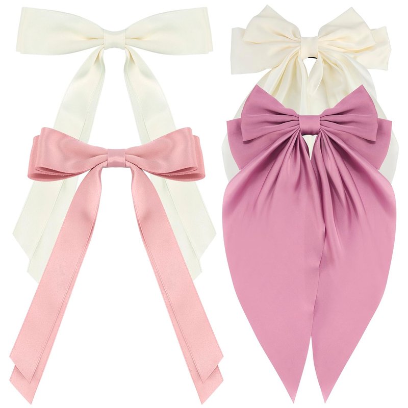 Atoden Hair Bows 4Pcs Silky Satin Hair Ribbons Cute Coquette Bows Beige Pink Oversized Long Tail Bow Hair Barrettes Metal Clips Big Bowknot Hair Accessories for Women Teen Girl Gifts Trendy Stuff
