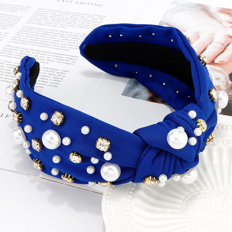 Atoden Knotted Headbands with Pearl Rhinestone Royal Blue Womens Headbands Wide Top Knot Headbands Beaded Headband Crystal Jeweled Head Bands for Women's Hair Embellished Headbands Non Slip Sparkly