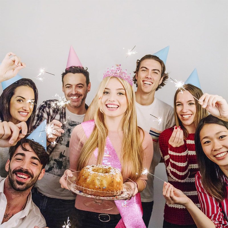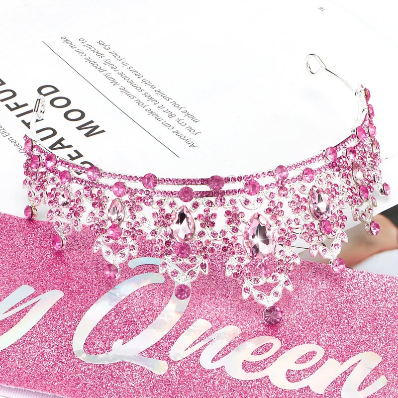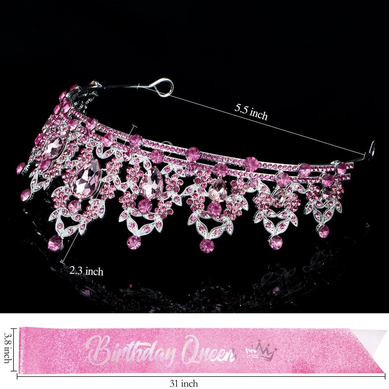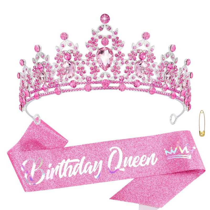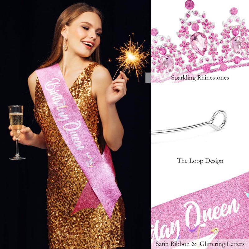 - 【Birthday Queen Sash and Crown】The crystal pink tiara is made of a sturdy metal, super solid and sturdy and can be worn for years. The little rhinestones on the crown shine brilliantly and the glitter & foil “Birthday Queen” sash is shimmering nicely, and come with a safety pin to fasten the ends for the best fit.