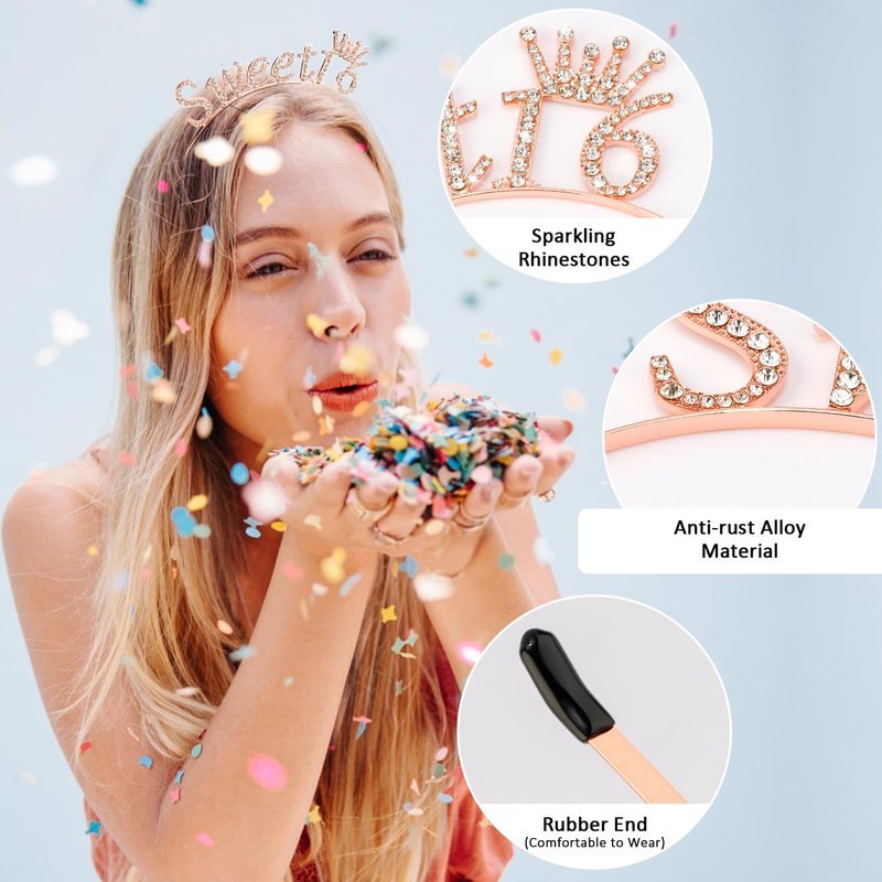Atoden Sweet 16 Princess Tiara Crown - Rose Gold Birthday Decorations, Party Favors and Gifts for Teen Girls