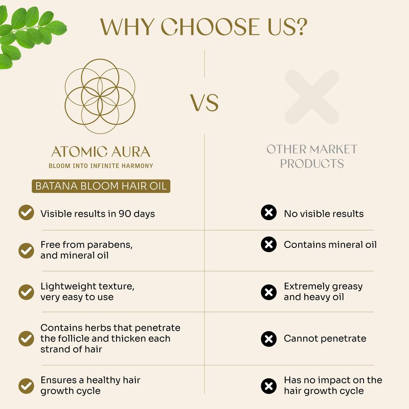 Elevate your hair care routine with Atomic Aura Batana Bloom Hair Oil, a luxurious blend of 15 exquisite oils designed exclusively to rejuvenate and enhance your locks. Crafted with care and precision, each ingredient plays a unique role in revitalizing your hair's natural radiance.