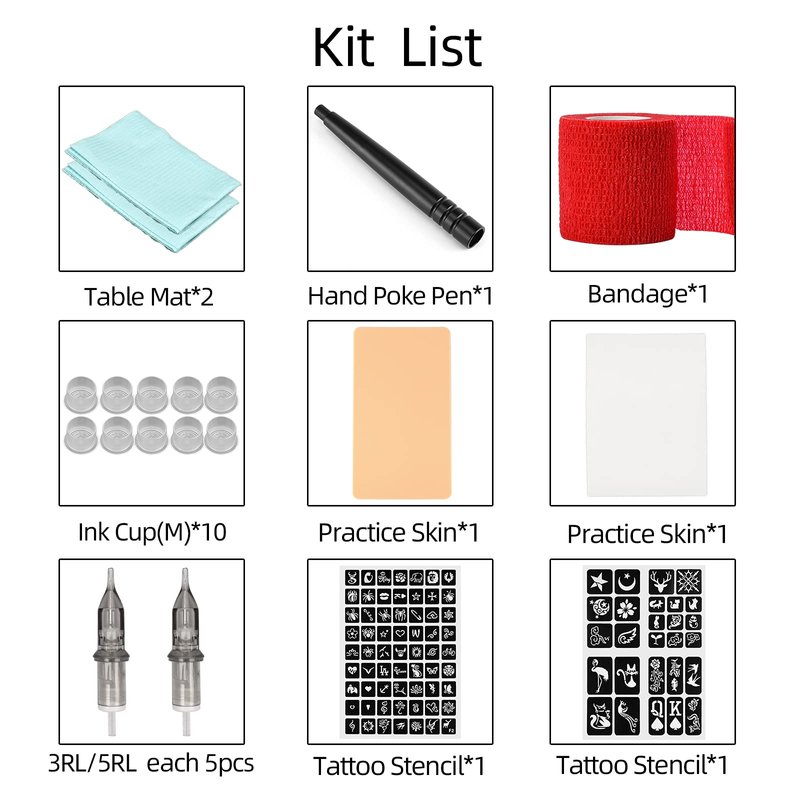 - ★ This DIY tattoo supply kit includes 1pc tattoo cartridge pen, 1pc disposable self-adhesive elastic bandage(random colors), 10pcs M Tattoo Ink Cups, 1pc 1 mm white practice skin, 1pc 2mm yellow practice skin, 2pcs Tattoo Stencils, 5pcs 3RL tattoo cartridge needles, 5pcs cartridge 5RL tattoo cartridge needles, 2pcs tattoo table mats. A wonderful choice for both beginners and skilled artists.