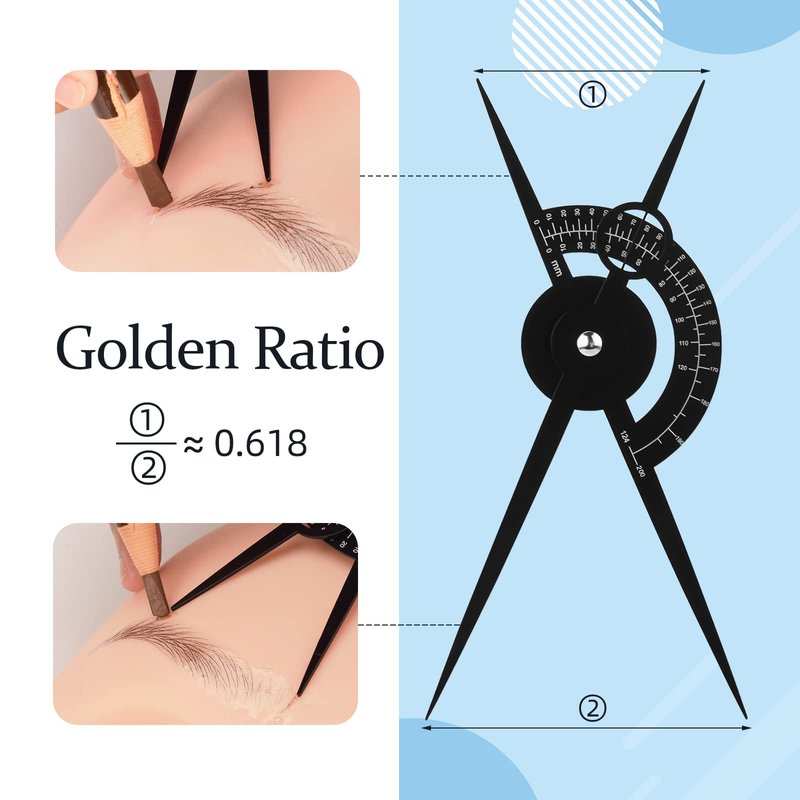 - Golden ratio eyebrow ruler to measure, position and shape eyebrows on both sides of the face in counterpoint.The two-point distance of the short ruler is the number of the inner ring of the protractor (0-124mm); The two-point distance of the long ruler is the outer ring number of the protractor (0-200mm)