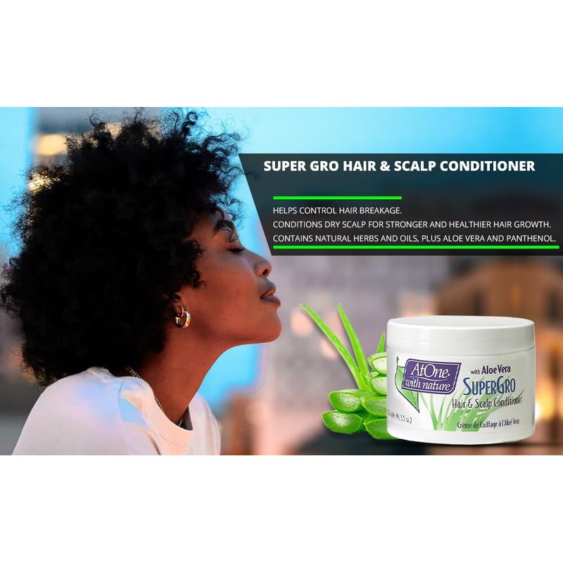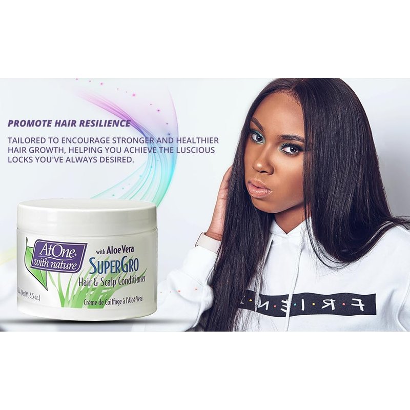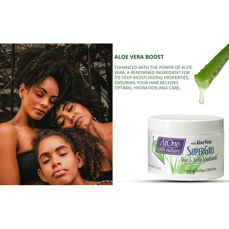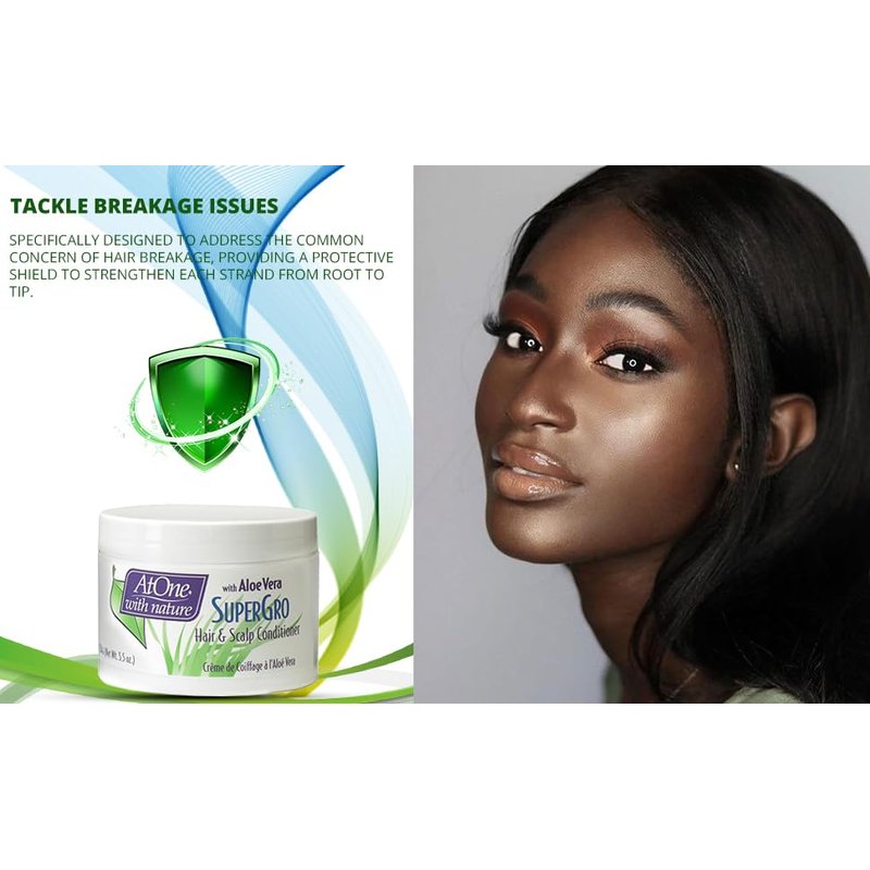 AtOne with Nature Hair and Scalp Conditioner SuperGro is for dry, brittle hair and scalp. Enriched with natural extracts, oils, Aloe Vera, and Panthenol, it provides intensive nourishment. Say goodbye to dryness as our formula replenishes moisture, leaving hair soft and revitalized. It strengthens hair, controls hair breakage, and soothes the scalp for stronger and healthier hair growth.