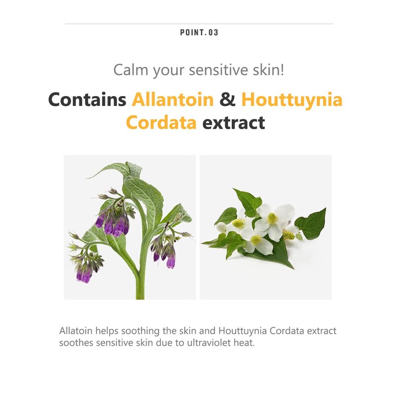 - Soothes and clams sensitive skin: Contains Allantoin and Houttuynia Cordata extract which are effective to soothe the sensitive skin due to ultraviolet heat.