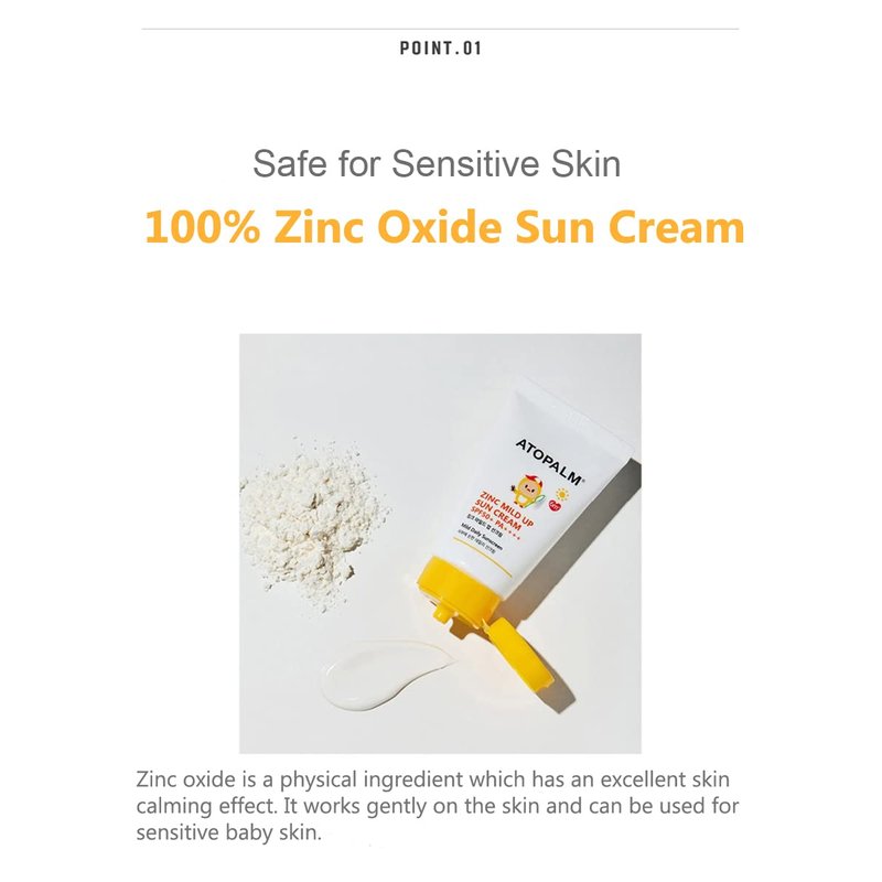 - Zinc Physical sunscreen with minimal of white cast that safely protects delicate skin. Zinc, a physical ingredient which has an excellent skin calming effect, it works gently on the skin, so it can be used for sensitive baby skin. Suitable for the age from 6 MONTHS and ABOVE.