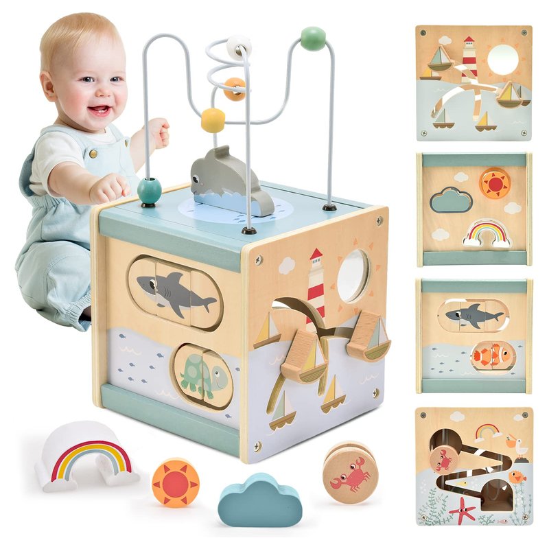 - 5 IN 1 Baby Activity Table - Our wooden activity cube for 1 year old comes with a 5-way game, including a top bead maze, shape sorter, sea animals flip board puzzle, sliding ship maze and race bead. This activity cube development toy keeps children busy and entertained.
