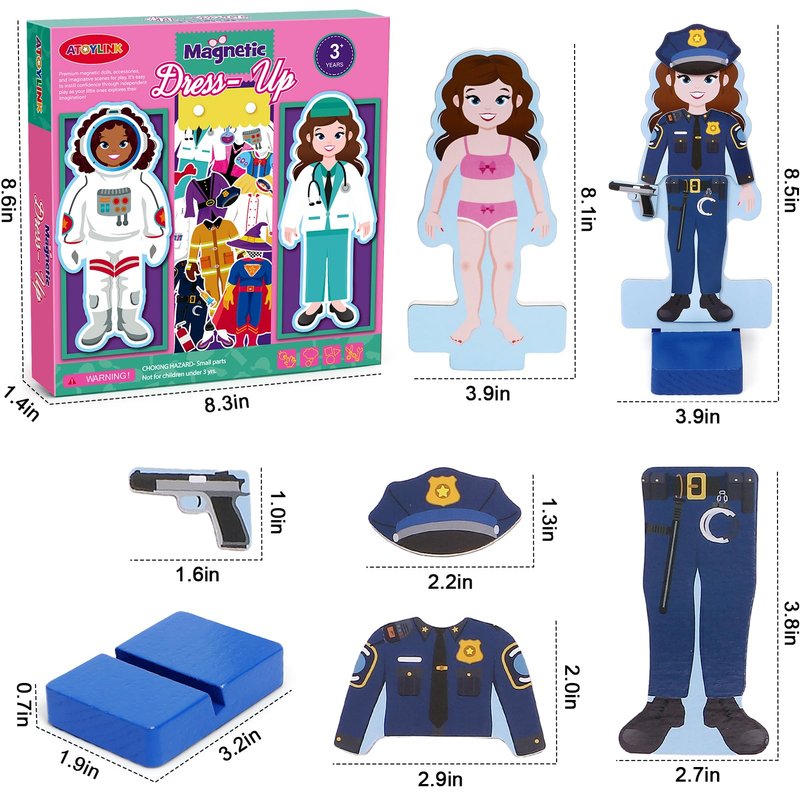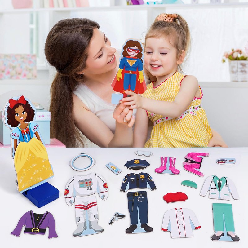 - Stands for Easy Display - The magnetic dolls dress up comes on a sturdy piece of wood with stands to hold it upright. Toddlers could play this role play game by matching specific doll clothes and accessories to various girls' community helpers including police, doctor, astronaut, scientist, singer and so on
