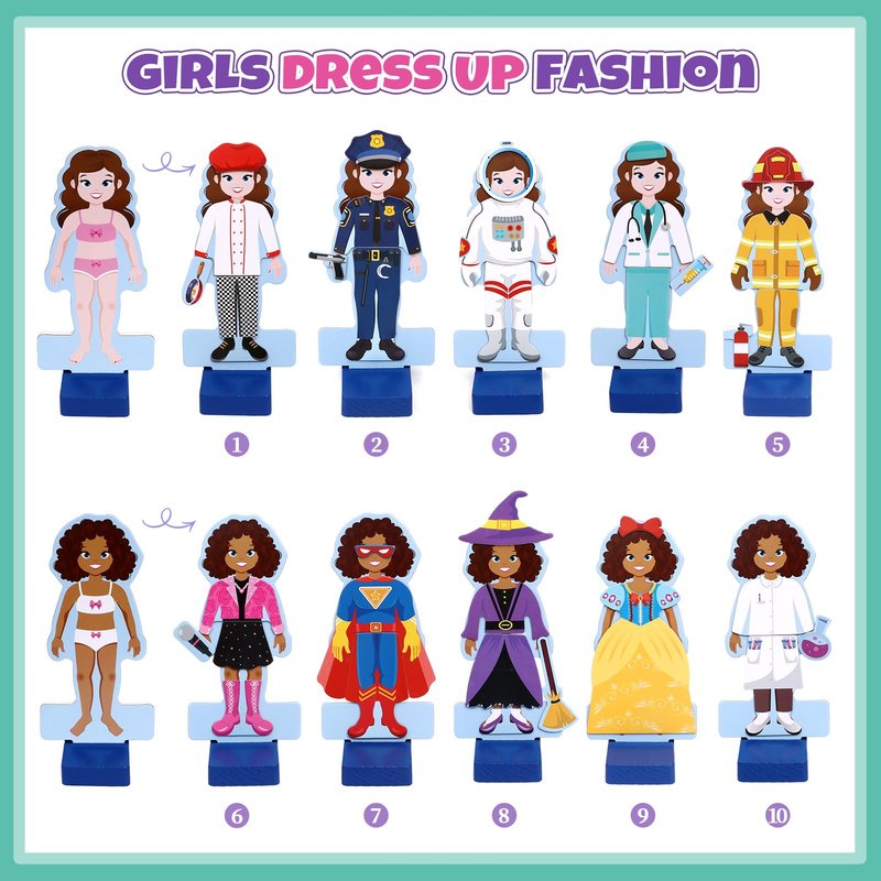 - Girls Magnetic Dress up - A must-have for little girls that love playing dress up. Comes with 2 different wooden girls dolls stand and an assortment of over 30 pieces of magnetic outfit and accessories in 10 various girls fashion. Enough for your princess girls to pretend play and match their own fashion