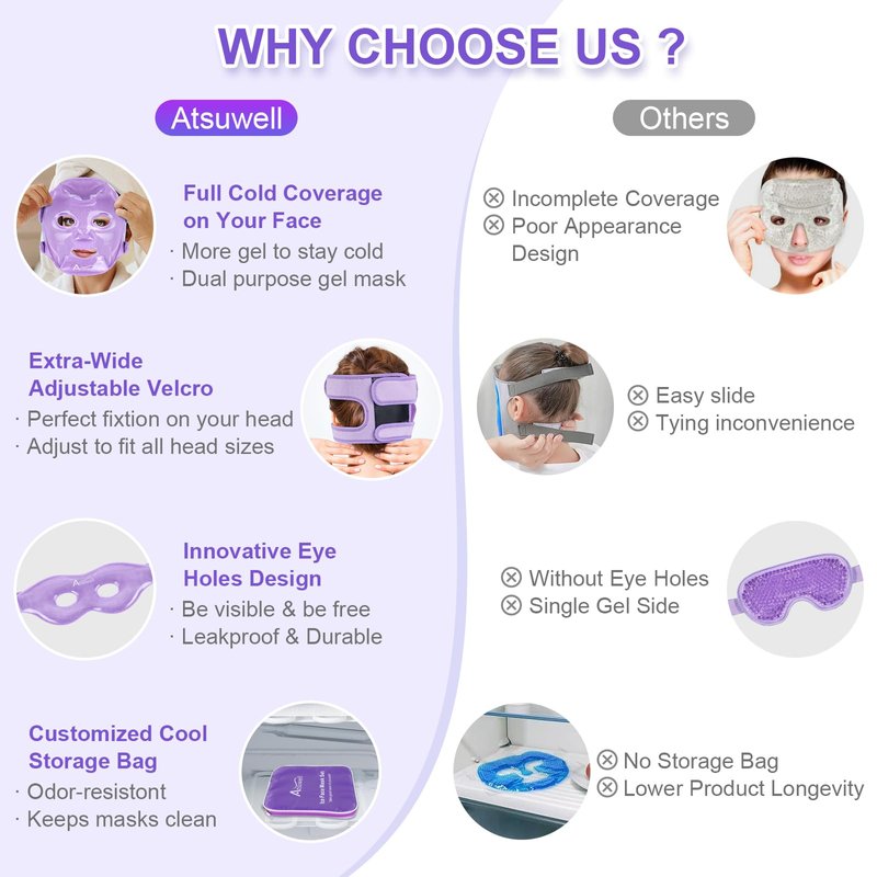 - Upgraded Fce Ice Mask - Unlike average cold face masks, our cool face mask adds the coverage of nose that can entirely cover your face.The unique split design of facial mask edge that easily conforms your facial contour.The frozen face mask with an integrated sheet shaped Velcro, which has perfect fixtion and easy operation.Ice face masks can be used to soothe facial sore muscles or inflammation, effectively relief from migraine, toothache, sinuses, bruising, allergy or cosmetic face surgery .