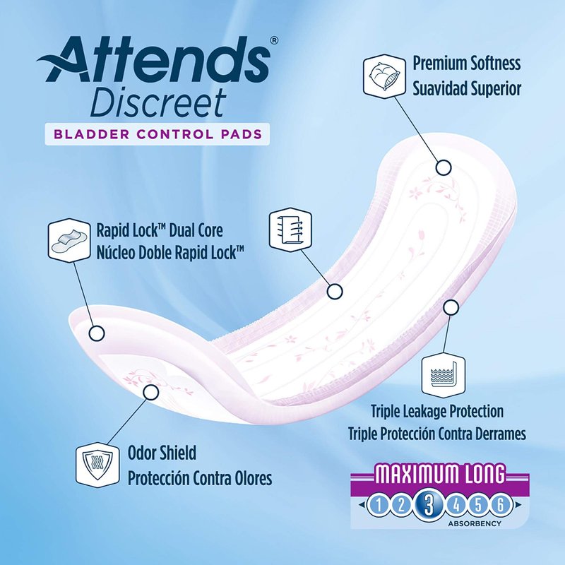 Manufacturer # ADPMAL Brand Attends Discreet Manufacturer Attends Healthcare Products Absorbent Capacity Moderate - Maximum Absorbency Application Bladder Control Pad Backsheet Color Purple Gender Female Topsheet Color White Type Long Usage Disposable Features Attends Discreet Pad can be worn with normal underwear as the adhesive strip on the back of the pad helps to ensure the pad stays in place. It has a soft top layer and can be used for moderate incontinence. Quick Dry Technology ensures the pad absorbs quickly leaving a dry top layer and dry skin. The fixation tape ensures the pad stays in place when you wear close fitting underwear, reducing the chance of leakage. Triple leakage protection Advanced DermaDry technology Odor shield, One - 20 Pack