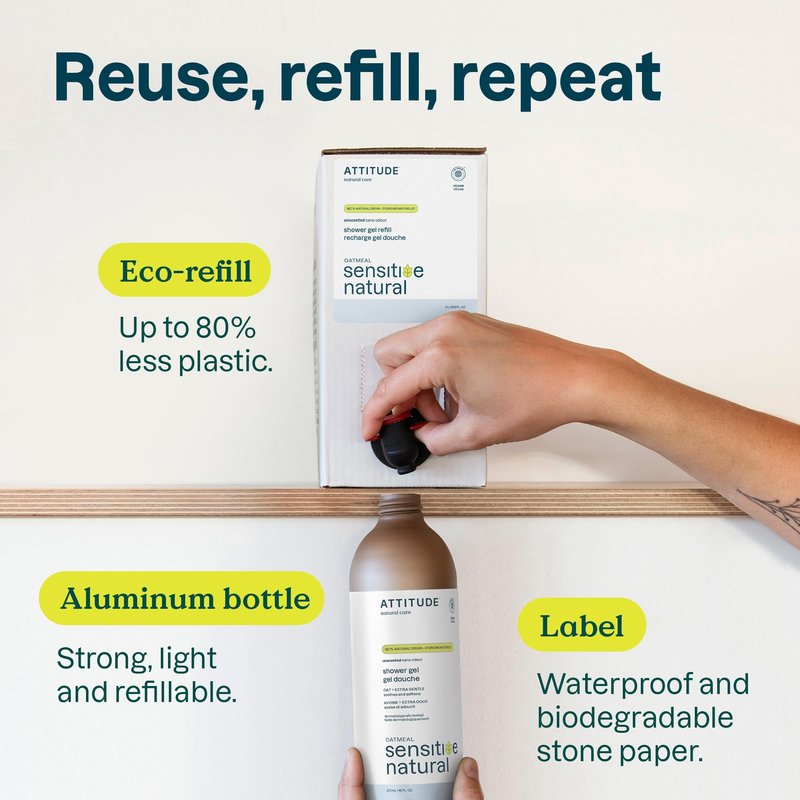 ATTITUDE Body Wash for Sensitive Skin, EWG Verified Shower Gel, Soothing Oat, Dermatologically Tested, Plant and Mineral-Based, Vegan Personal Care, Aluminum Bottle, Unscented, 16 Fl Oz