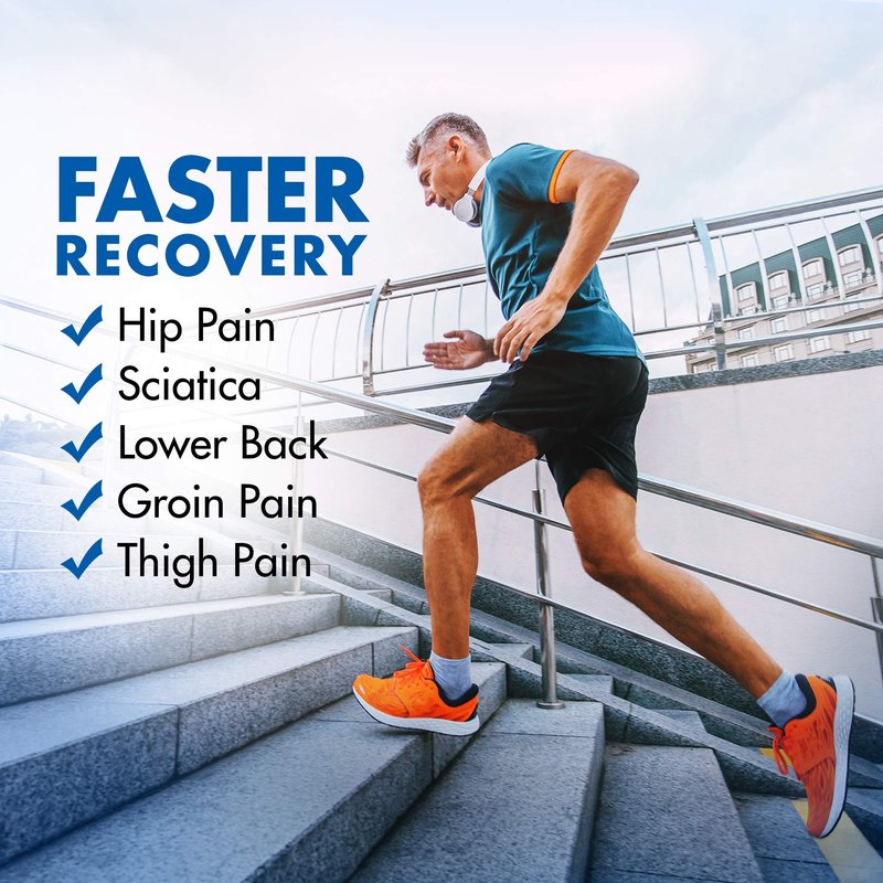 - DELIVERS: Immediately relieves pain from any kind of sciatica, hip, groin, bursitis, arthritis, thigh, and hamstring related injuries. Also supports quadricep, glute, hip abductor, hip flexor and sacroiliac pain.