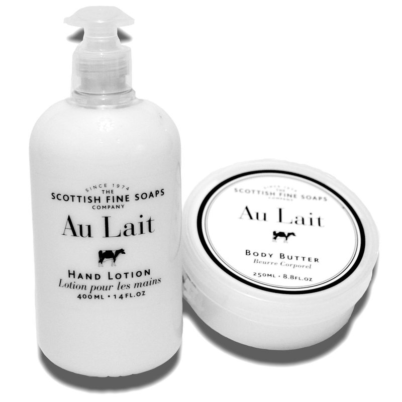 Scottish Fine Soaps Au Lait Hand Lotion 14 Fl.Oz. Pump From Scotland. Restore skins suppleness and softness with this light, velvety smooth Hand Lotion. Whisked together with two of nature's finest moisturizers, Milk and Natural Silk, to aid hydration and nourish dry hands. Intense Moisturizing With Milk & Cocoa Butter Leaves Skin Soft, Smooth & Delicately Fragranced