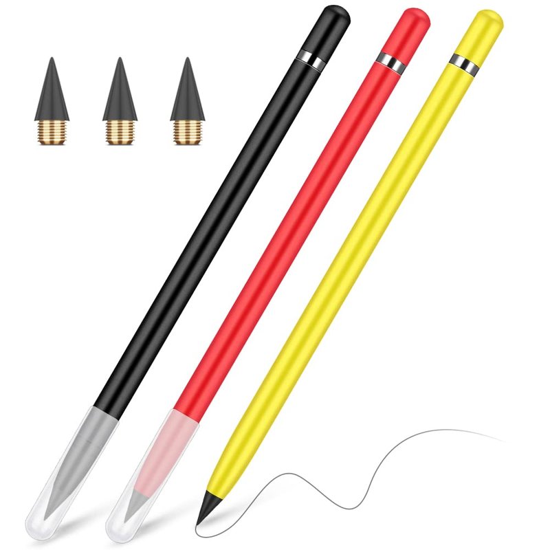 AUAUY 3 PCS Metal Inkless Pencil, Infinity Pencil, Reusable Everlasting Pencil, Replaceable Nib Pencil with 3 Replaceable Nib for Writing Drawing Home Office School Supplies(Black&Red&Yellow)