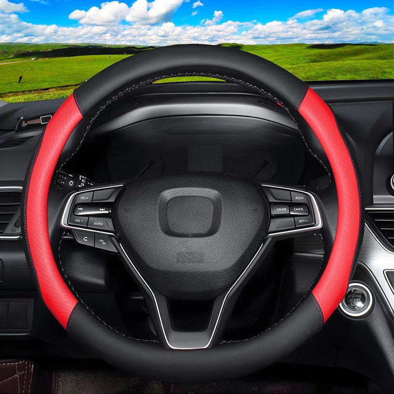 AUCELI Car Steering Wheel Cover, Universal Leather Auto Steering Wheel Protector, Carbon Fiber Anti-Slip Auto Interior Accessories for Men and Women, 15 inch for Most Cars, Trucks, SUV(Black/Red)