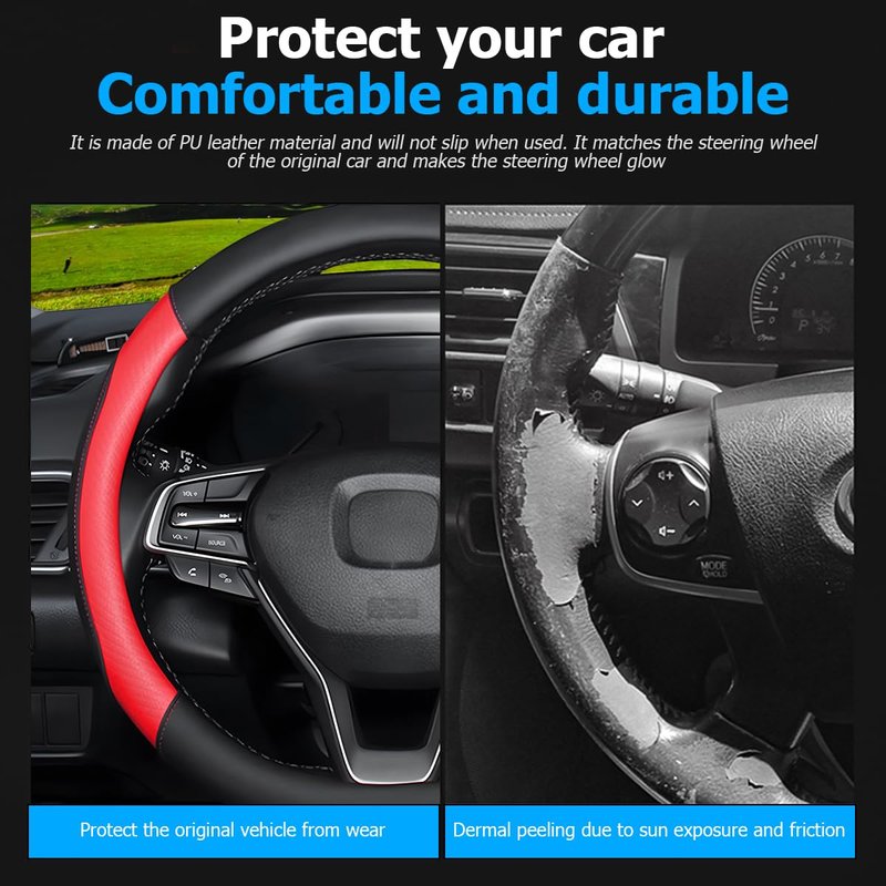 - 【High Quality】: This car steering wheel cover is made of top quality durable pu leather and carbon fiber material with fine workmanship and reinforced stitches. It is super soft, comfortable, durable, cold and heat-resistant, four-season universal, and offers you a long service time.