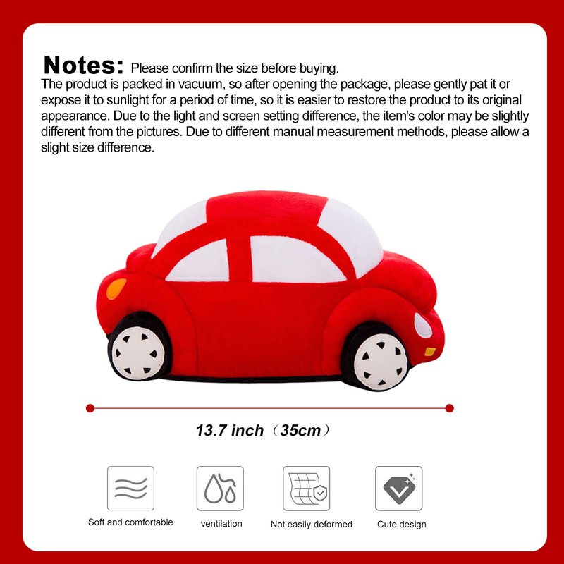 - 【Product Size】: The size of plush car is about 35cm/13.7". The size of the product is ideal for use as a children's pillow. Car plush pillow can be used as a lulling toy. Children can hug it into a sweet dream.