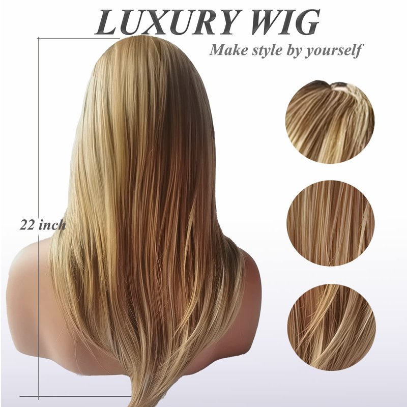 Auflaund Long Straight Blonde Wigs Imported Synthetic Ombre Dark Root Layered High Dentistry Glazed Hair Replacement Wigs for Women with Inclined Bangs 22 Inches (T/Blonde)