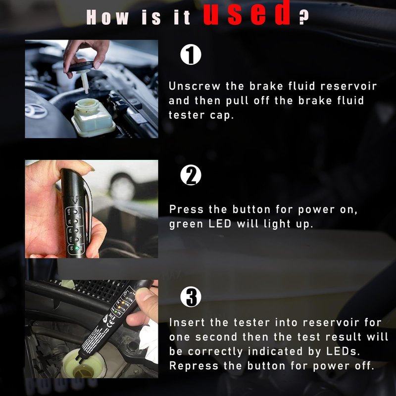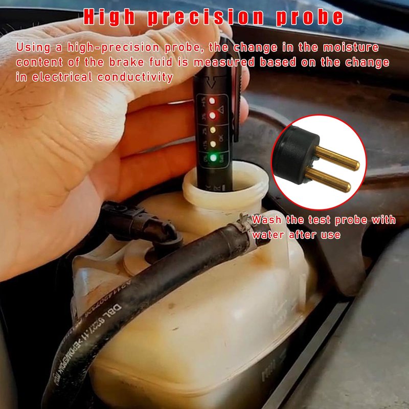 - 【Usage Method】: This brake fluid tester is easy to use. Press the power button and the green LED light will light up indicating that it is ready for use. Insert the metal probe into the brake fluid, after a few seconds, the corresponding LED light will light up and display the result. After the test is completed, the test pen will automatically close after 12 seconds.