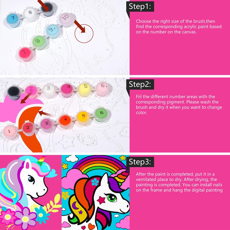 - Popular Cute Pattern for Unicorn - There are 2 diffferent digital patterns for unicorn of the DIY oil painting kits. Cute pink color and colorful color. Children can also create a unique color world through their own color matching.The finished painting can be used as an ornament to decorate the living room, study room, children bedroom etc.