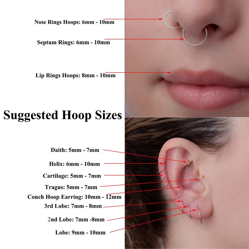 - Multi use: Can be used as nose rings hoop, septum piericng jewelry, lip rings, belly button ring, cartilage earring hoop, tragus earrings, daith earrings, helix earring, rook piercing jewelry, conch piercing jewelry.