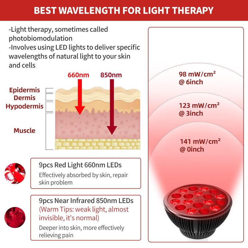 Each red therapy light bulb has 18pcs high power leds in total. 9pcs 660nm deep red leds + 9pcs 850nm near infrared leds making it the best wavelength for light therapy.