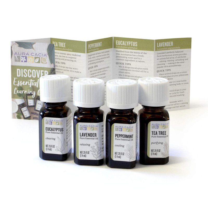 - VERSATILE AND AROMATIC - Aura Cacia Discover Essential Oils Kit includes Aura Cacia Lavender Essential Oil, Aura Cacia Peppermint Essential Oil, Aura Cacia Eucalyptus Essential Oil and Aura Cacia Tea Tree Essential Oil. Each kit also includes a learning guide with quick tips, recipes, dilution rates and safety guidelines.