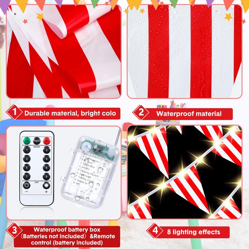- Battered Operated and 8 Lighting Modes: this light up red and white striped banner flags, feature 8 modes namely, combination, wave, sequential, slow, chase/flash, slow fade, twinkle/flash, and steady on, adding a fun and festive element to your decor