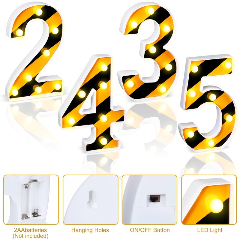 - Novelty Construction Theme Design: captivate your guests with our stylish construction themed decorative LED light up number letters, brilliantly designed with an eye catching yellow and black stripe design and inserted warm light color, ideally fitting into construction themed parties, boys birthdays, class activities and baby showers, you'll be sure to have your guests awed with these classical decorations