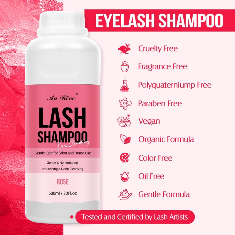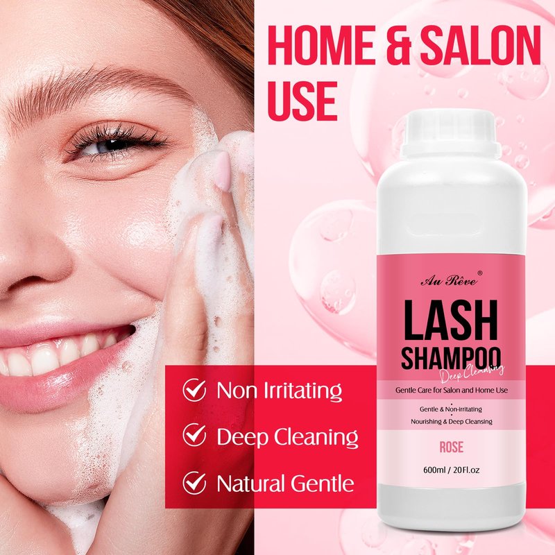 AuReve Lash Shampoo Bulk for Lash Extensions 600 Ml/20fl.oz Eyelash Extension Cleanser Oil Free Lash Cleanser for Eyelash Care, Gentle Foaming Eyelash Shampoo for Salon Home Care (Rose 600ml)