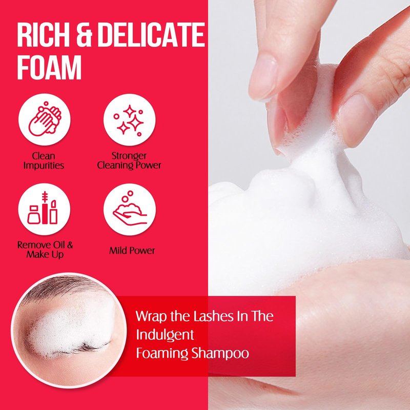 - Deep cleansing: This eyelash shampoo for lash extensions can make foam easily. Effectively removes oil, dust and makeup residue from lashes, lid margins and under eye area. Meanwhile, nourish your eyelashes. Extend the life of natural and artificial false eyelashes.