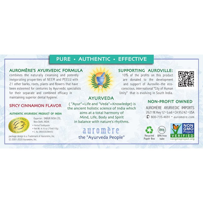 Auromere Ayurvedic Herbal Toothpaste, Cinnamon - Vegan, Natural, Non GMO, Fluoride Free, Gluten Free, with Neem & Peelu (3.57 oz), 2 Pack