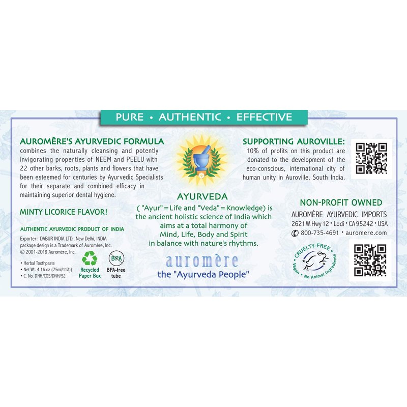 Auromere Ayurvedic Herbal Toothpaste, Classic Licorice Flavor - Vegan, Natural, Non GMO, Fluoride Free, Gluten Free, with Neem & Peelu (4.16 oz), 4 Pack
