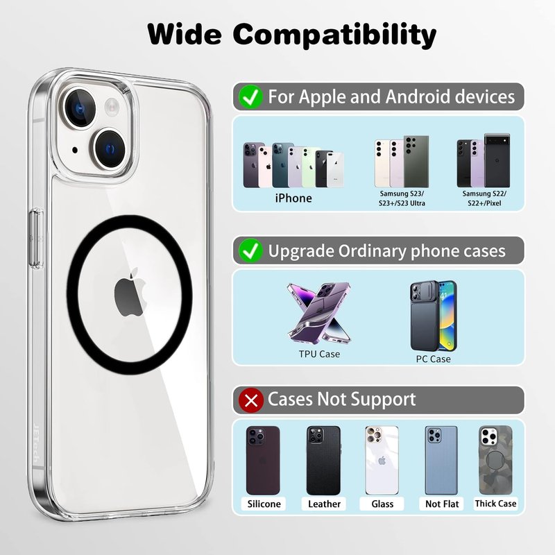 - 【Wide Compatibility】For Magsafe Ring Adapter is compatible with most phones, including iPhone 16/15/14/Plus/Pro/Pro Max/13/Mini/Pro/ProMax/12/Mini/Pro/ProMax/11/Pro/ProMax/iPhone X/XS/8Plus, iPad air/pro, and Galaxy S9/10/20/21/22/23/Note8/9/10/20/Z series. This magnetic ring sticker can also be used with magnetic accessories such as magnetic phone grip, magnetic card wallets and magnetic battery packs. * When you use this metal ring sticker with magnetic-compatible accessories, please separate them by sliding them parallel instead of pulling them apart.