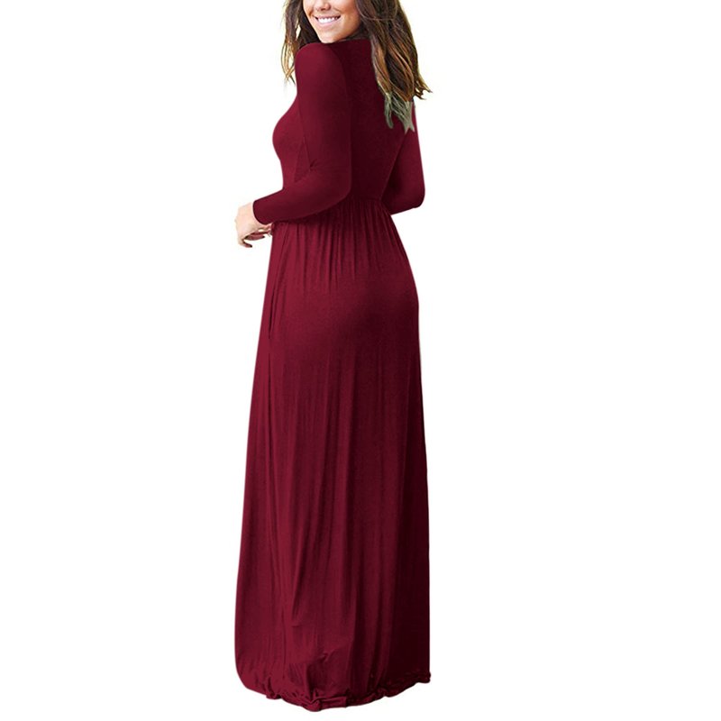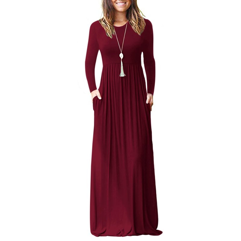 AUSELILY Women's Long Sleeve Casual Loose Pocket Maxi Party Long Dresses for Women (M, Wine Red)