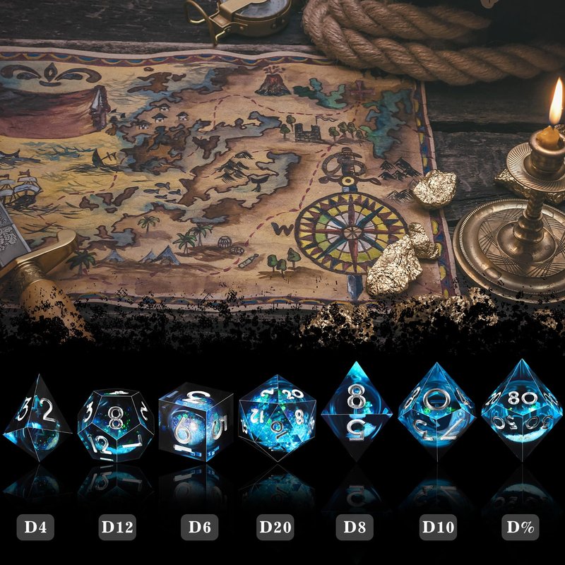AUSTOR Liquid Core Resin DND Dice Sharp Edge Polyhedral Dice 7-Die DND Dice Set Quicksand Handmade Resin Dice for Dungeons and Dragons RPG MTG Table Games, Blue & Black