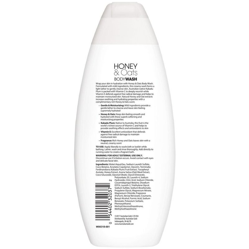 - A MILD MOISTURIZING BODY WASH - Pamper your skin with Australian Gold's Honey & Oats Body Wash; Formulated with mild ingredients, it forms a gentle lather to cleanse your skin and leaves it feeling supremely hydrated and luxurious