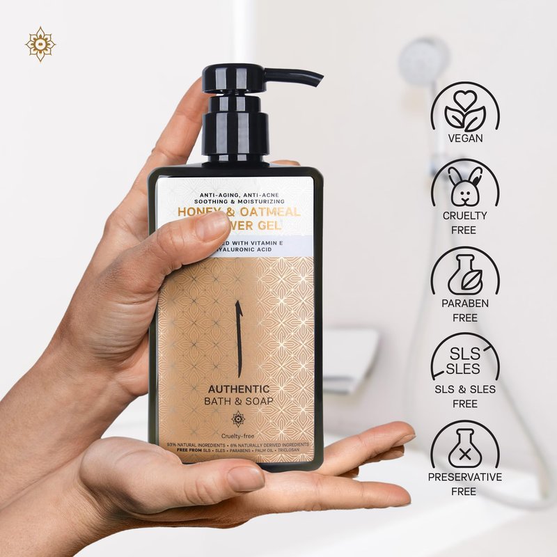 Experience the luxurious embrace of Authentic Bath & Soap's Natural Honey & Oatmeal body wash, enhanced with the hydrating power of hyaluronic acid and the nourishing benefits of vitamin E. This 16.9 oz shower gel is a blend of nature's finest ingredients, designed to provide a deeply moisturizing and rejuvenating shower experience. Our shower gel is enriched with natural organic honey and oatmeal, offering soothing and moisturizing effects that are ideal for all skin types. The addition of hyaluronic acid ensures your skin retains its natural moisture, leaving it feeling smooth and hydrated. Vitamin E, known for its antioxidant properties, helps protect your skin from environmental stressors while enhancing its natural radiance. Formulated with natural ingredients, our shower gel offers a gentle yet effective cleansing, free from harsh chemicals and synthetic additives. Packaged in nature-safe materials and cruelty-free, we ensure our commitment to the planet is reflected in every aspect of our product. Indulge in the nourishing, hydrating benefits of our natural shower gel, and make your daily cleansing routine a luxurious, skin-loving experience. Perfect gift for men, gift for women gift for him gift for her.