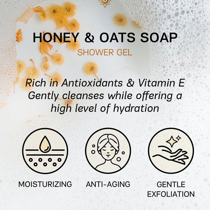 - NOURISHING HONEY AND OATMEAL - Infused with natural honey and oatmeal, known for their moisturizing and soothing properties, perfect for all skin types including sensitive skin.