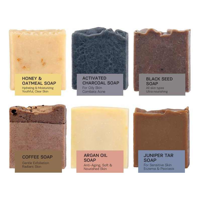 - SPECIALLY CURATED FOR MEN - A thoughtfully assembled set of 6 natural bar soaps (Honey and Oatmeal, Blackseed Oil, Juniper Tar, Activated Charcoal, Argan Oil, Coffee) designed specifically for men’s skincare needs, providing deep moisturization and soothing effects.